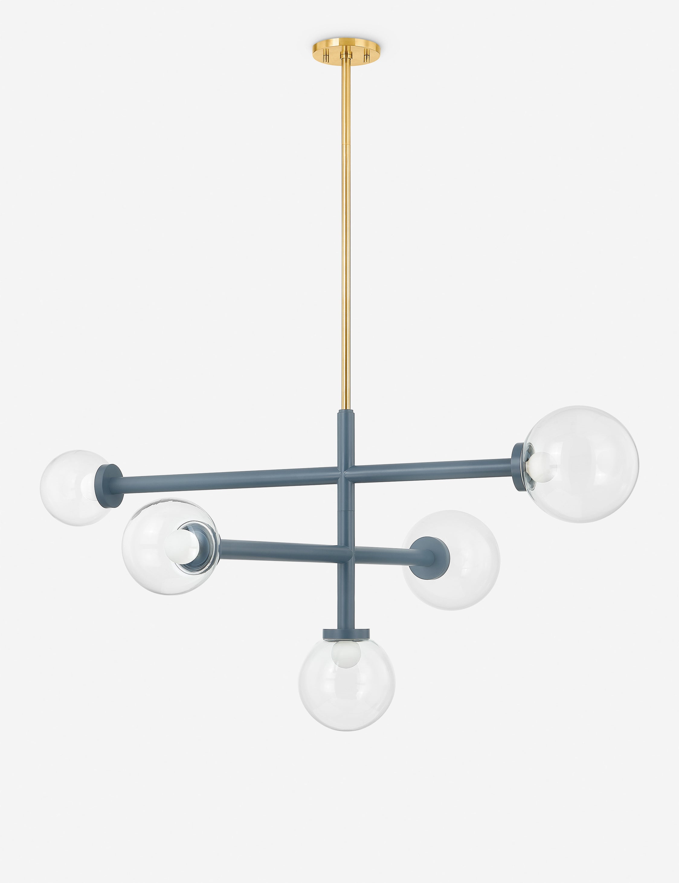 Elevate your space with this stunning 5-light chandelier. Featuring an aged brass and slate blue finish, it combines modern design with mid-century charm. Clear glass shades add a touch of elegance, making it perfect for any setting.