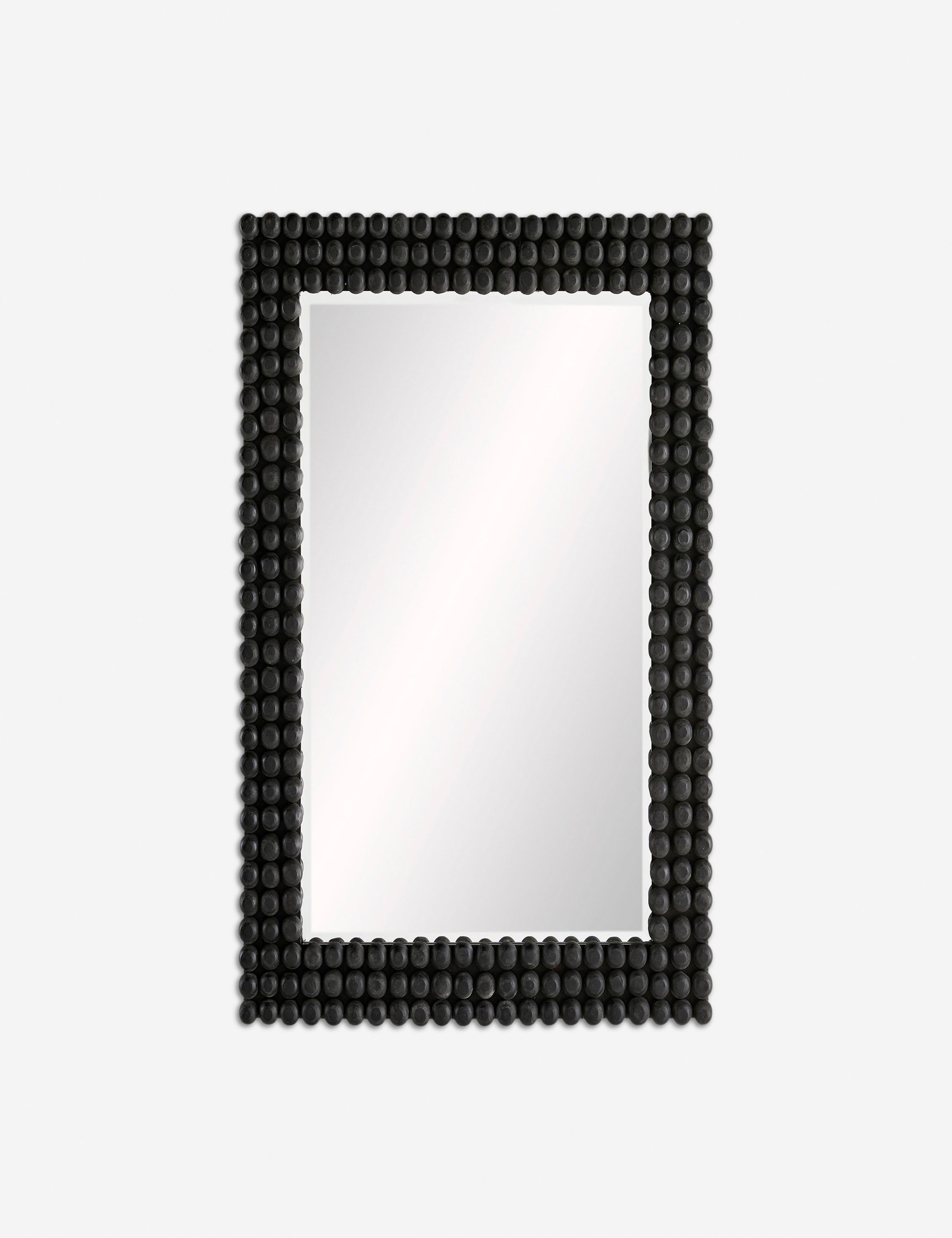 Embrace a blend of modern elegance and bohemian charm with the Paxton Mirror. Hand-carved wooden knobs adorn its frame, finished in a sophisticated black stain. This piece, with its tactile textures and African-inspired design, features a beveled edge, enhancing any space with its rich, visual appeal.