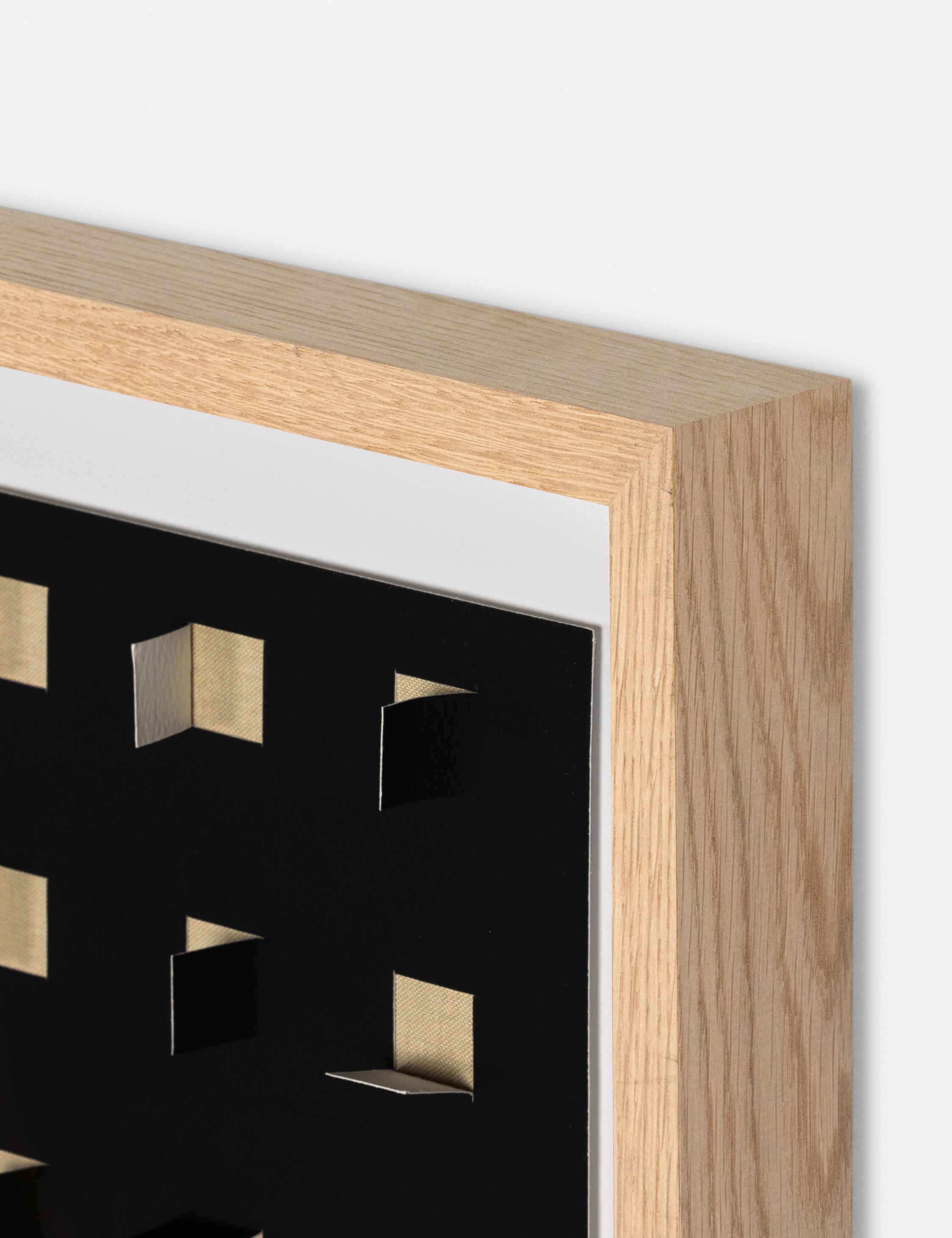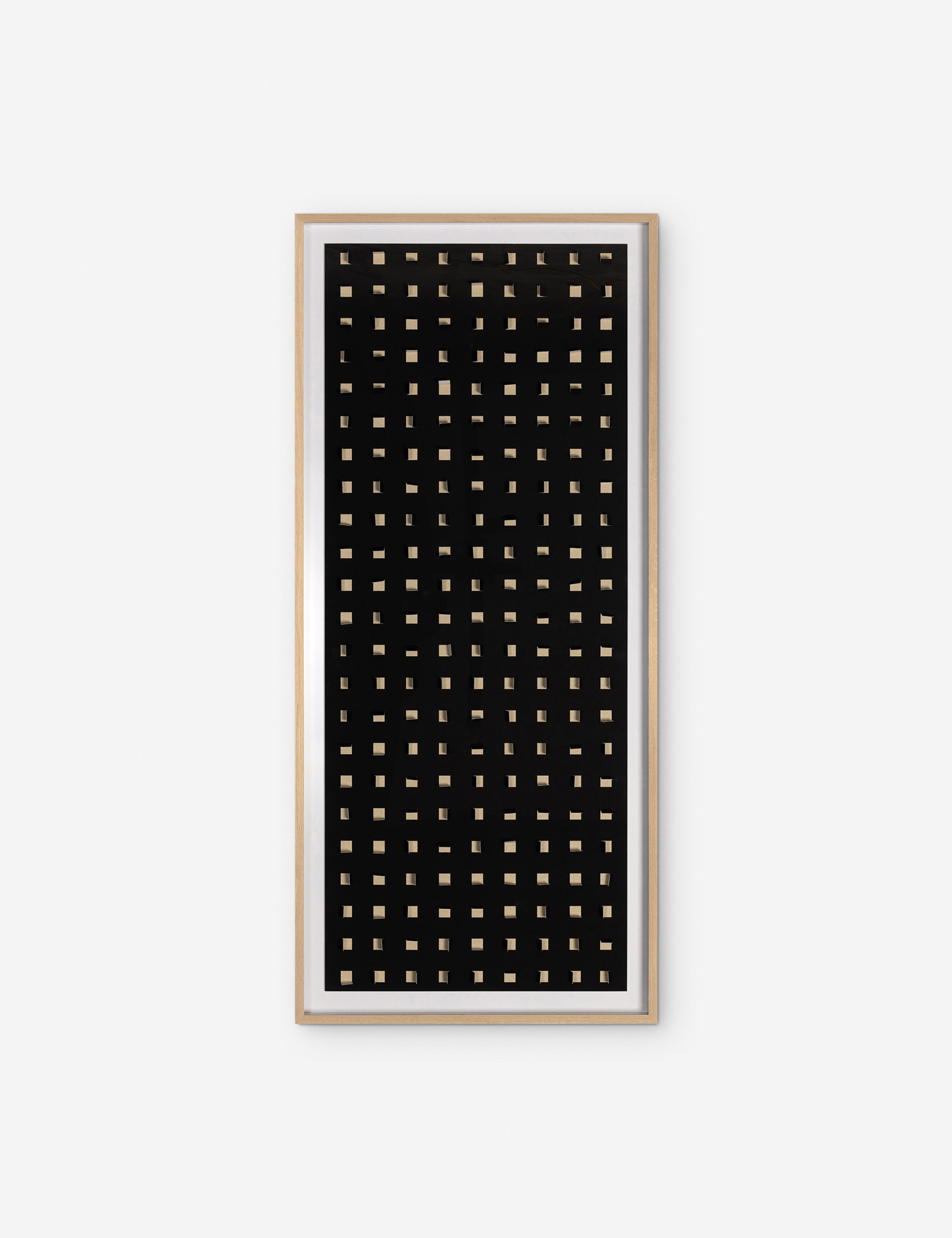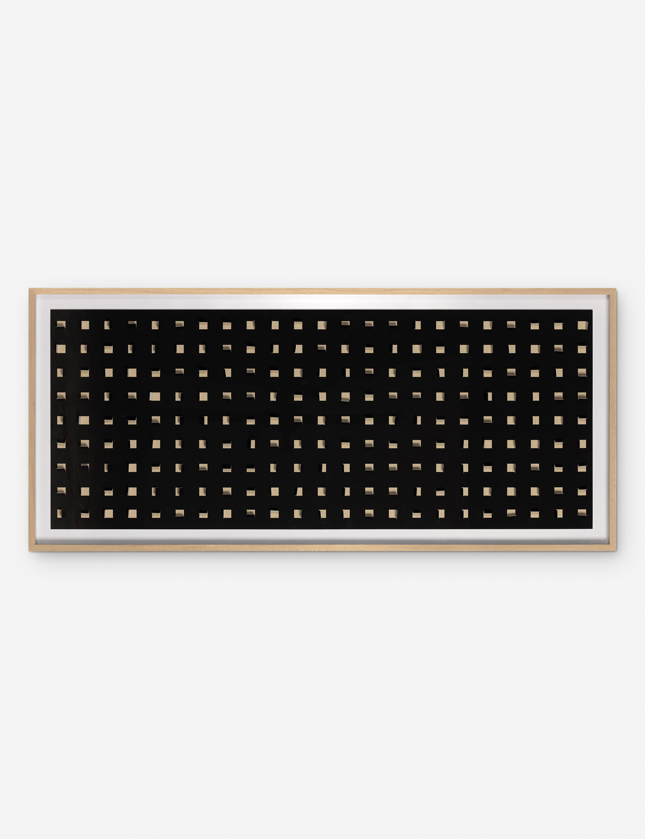 Elevate your space with this modern abstract canvas wall art. Featuring a striking grid pattern of paper cutouts, framed in vertical grain white oak, this piece adds texture and visual interest to any room. The tan and black color scheme complements contemporary decor, while the acrylic glazing ensures durability.