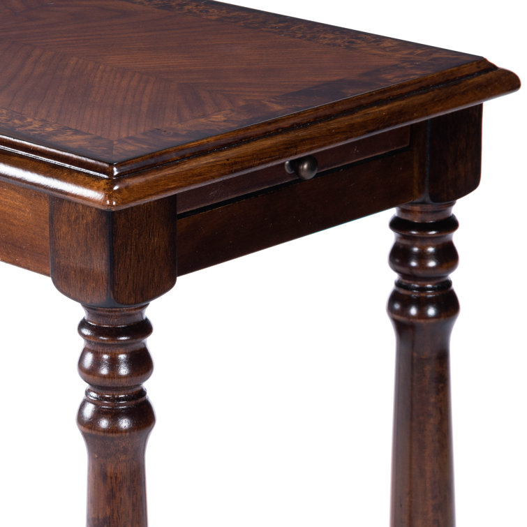 Exquisitely designed, this chairside table combines functionality with style. Featuring select wood solids and rich cherry veneer top, framed with elegant mapa burl veneers. Includes a convenient pull-out shelf for beverages, making it a perfect addition to any living space.