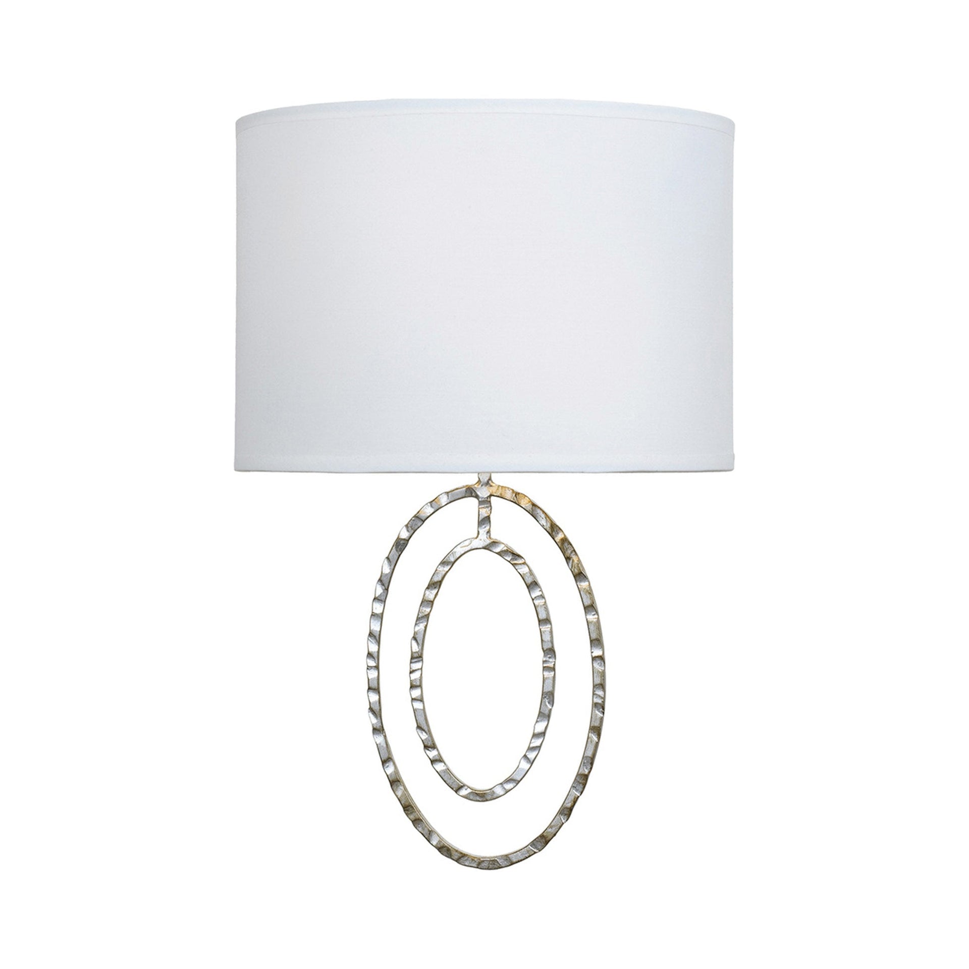 Illuminate your space with this elegant sconce featuring antique silver oval rings and a white silk shade. This dimmable, direct-wired fixture adds a touch of sophistication to any interior.