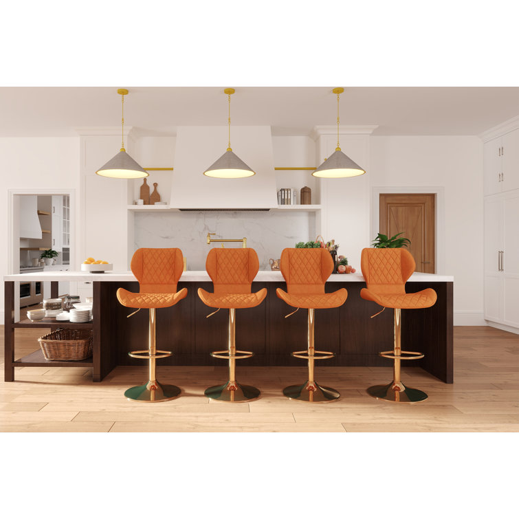 Elevate your space with these luxurious orange velvet bar stools. Featuring a gold base, adjustable height, and swivel functionality, they offer both style and comfort. Perfect for kitchen islands or home bars.