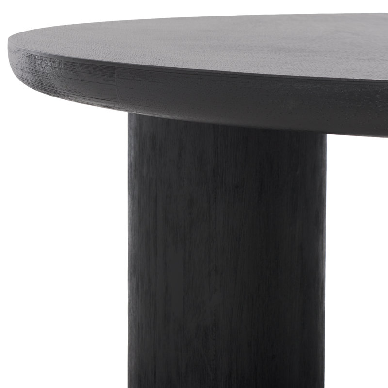 Elevate your outdoor space with the Aicha Black Round Wood Coffee Table. Its sturdy three-leg base and rich natural finish add rustic charm, while the round shape and block feet provide a modern touch. Perfect for any patio or garden setting.
