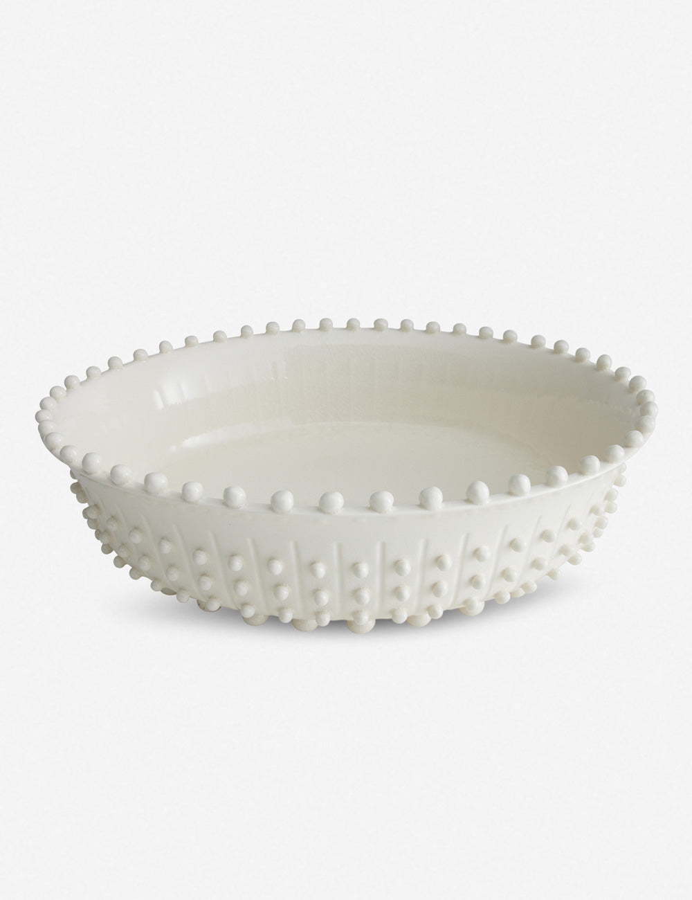 This exquisite 16.5" ivory ceramic centerpiece bowl, adorned with hand-applied beading, brings playful elegance to any table. Versatile and chic, it's perfect for displaying potpourri, seasonal decor, or serving as a stylish tray for jewelry and keys.