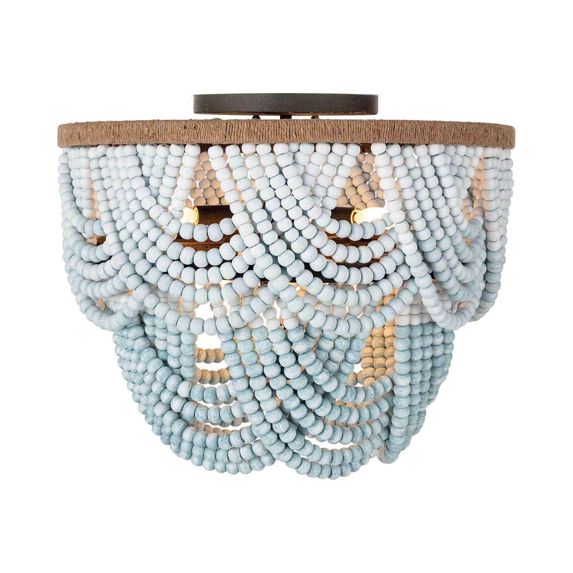 Illuminate your space with this stunning flush mount ceiling fixture. Featuring blue and natural wood beads draped gracefully in gradient layers, this 6-light fixture adds a coastal and bohemian charm to any room. The jute-wrapped circular frame enhances its natural appeal. Perfect for dry locations, it uses E12 base bulbs and is hardwired for a seamless look.