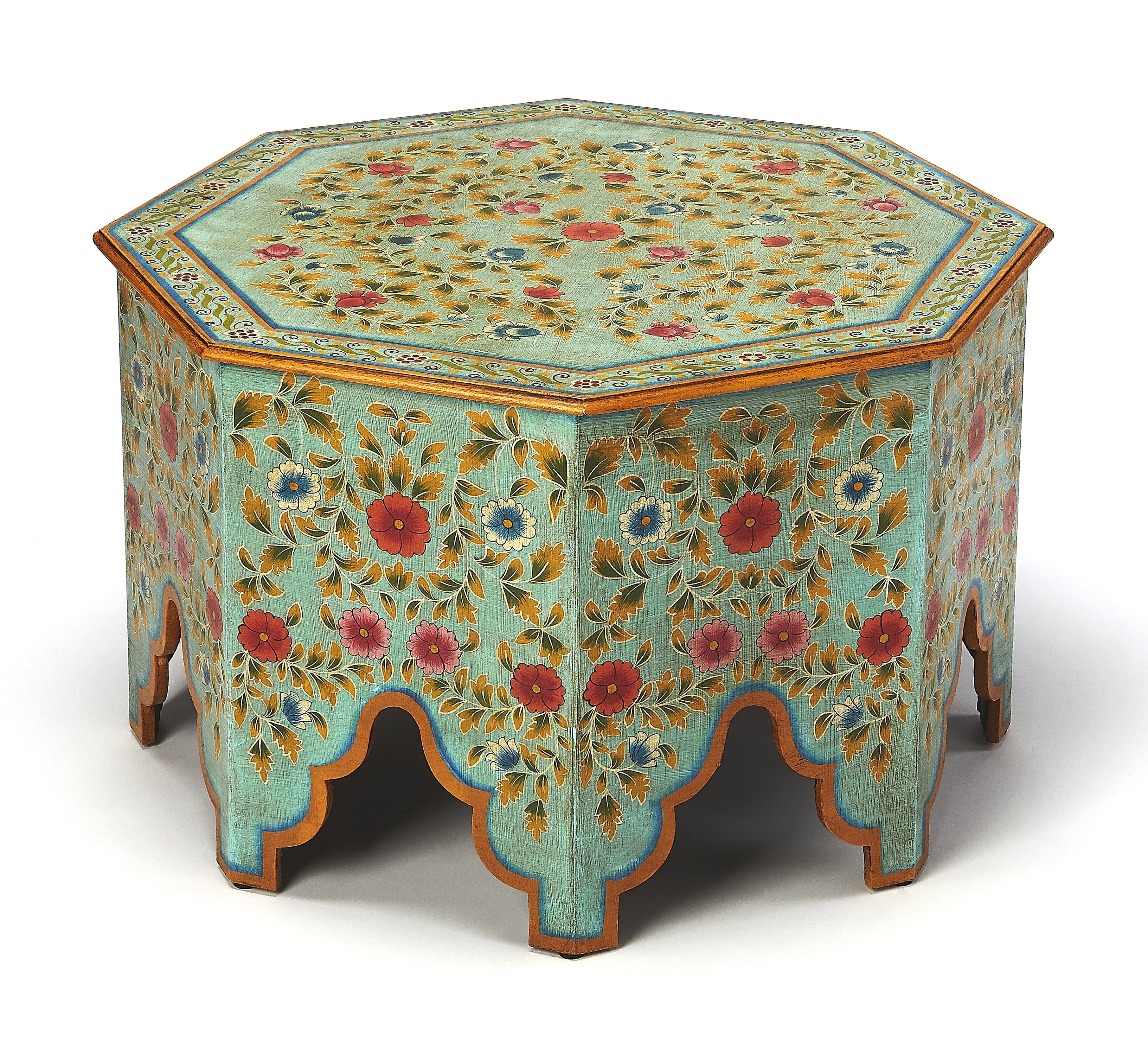 Add a pop of color to your living room with this hexagonal hand-painted coffee table. Crafted with precision from Meranti wood and MDF, it brings bohemian chic to your space. Perfect for those who appreciate unique, artistic furniture.