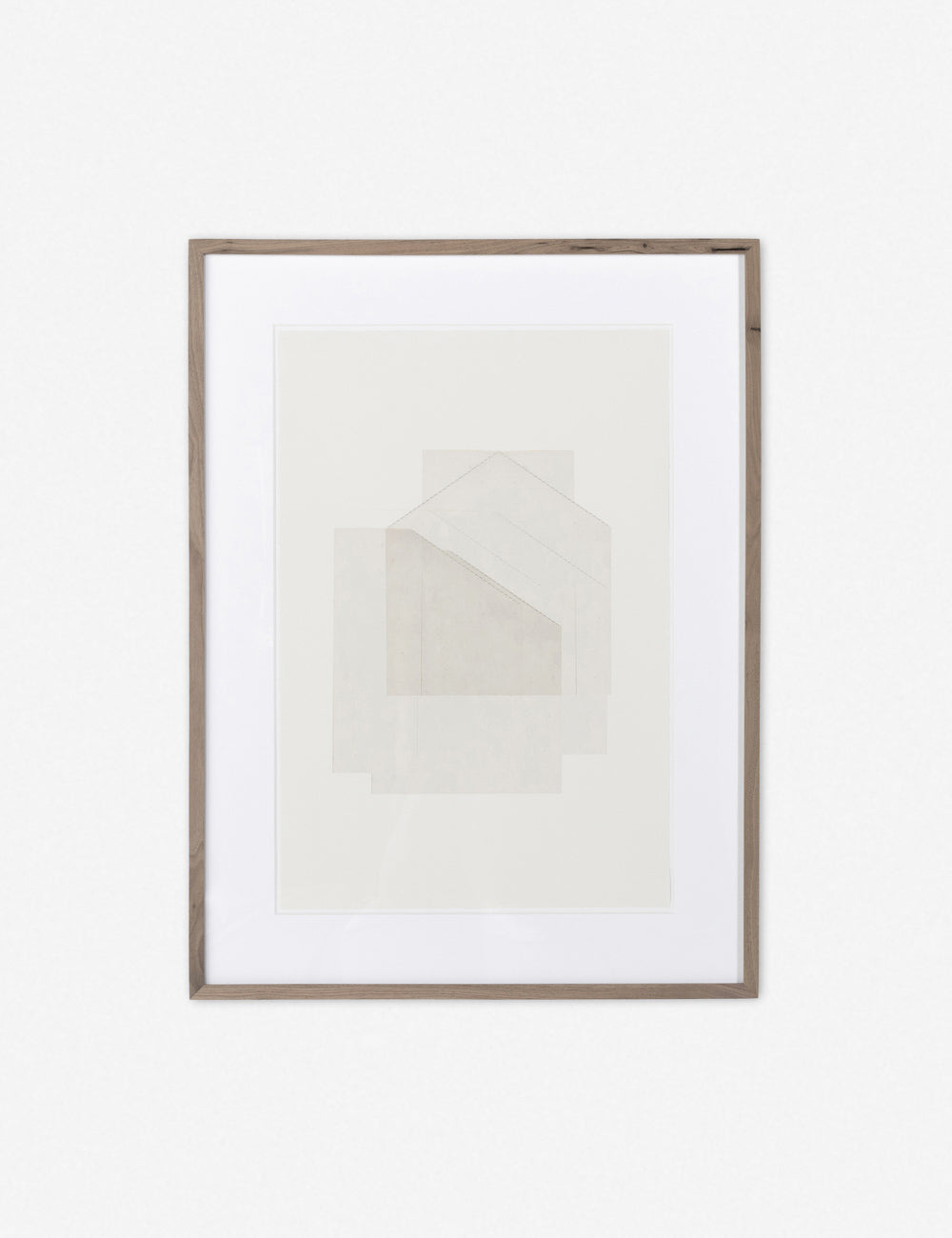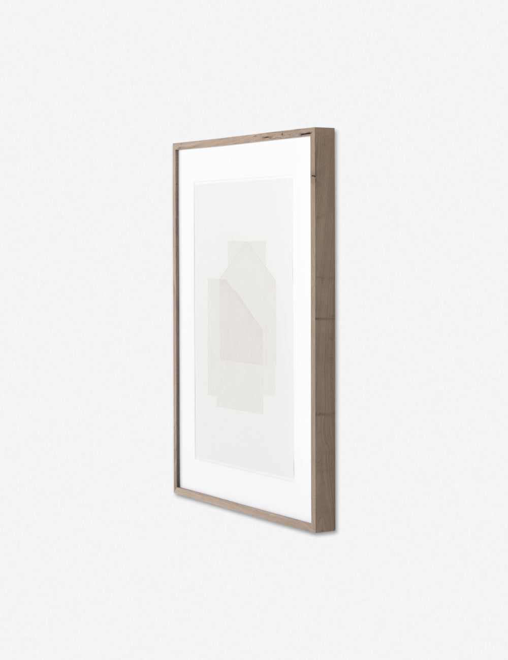 This striking abstract wall art by Alyson Fox features geometric shapes in tonal layers, framed in rustic walnut. Perfect for adding a modern, minimalist touch to any room. Handmade in Austin, Texas.
