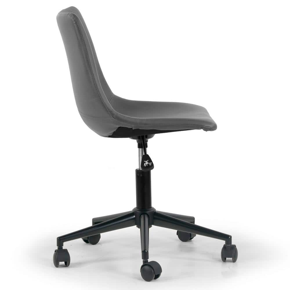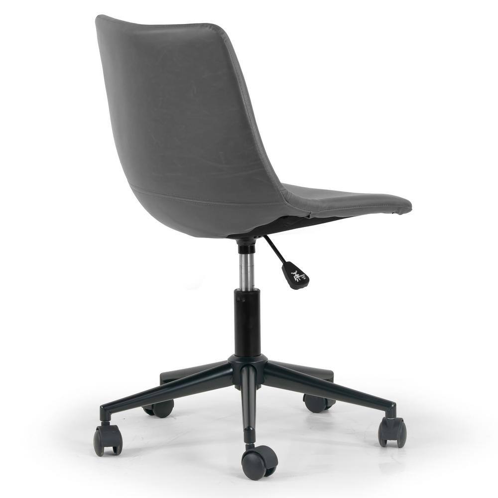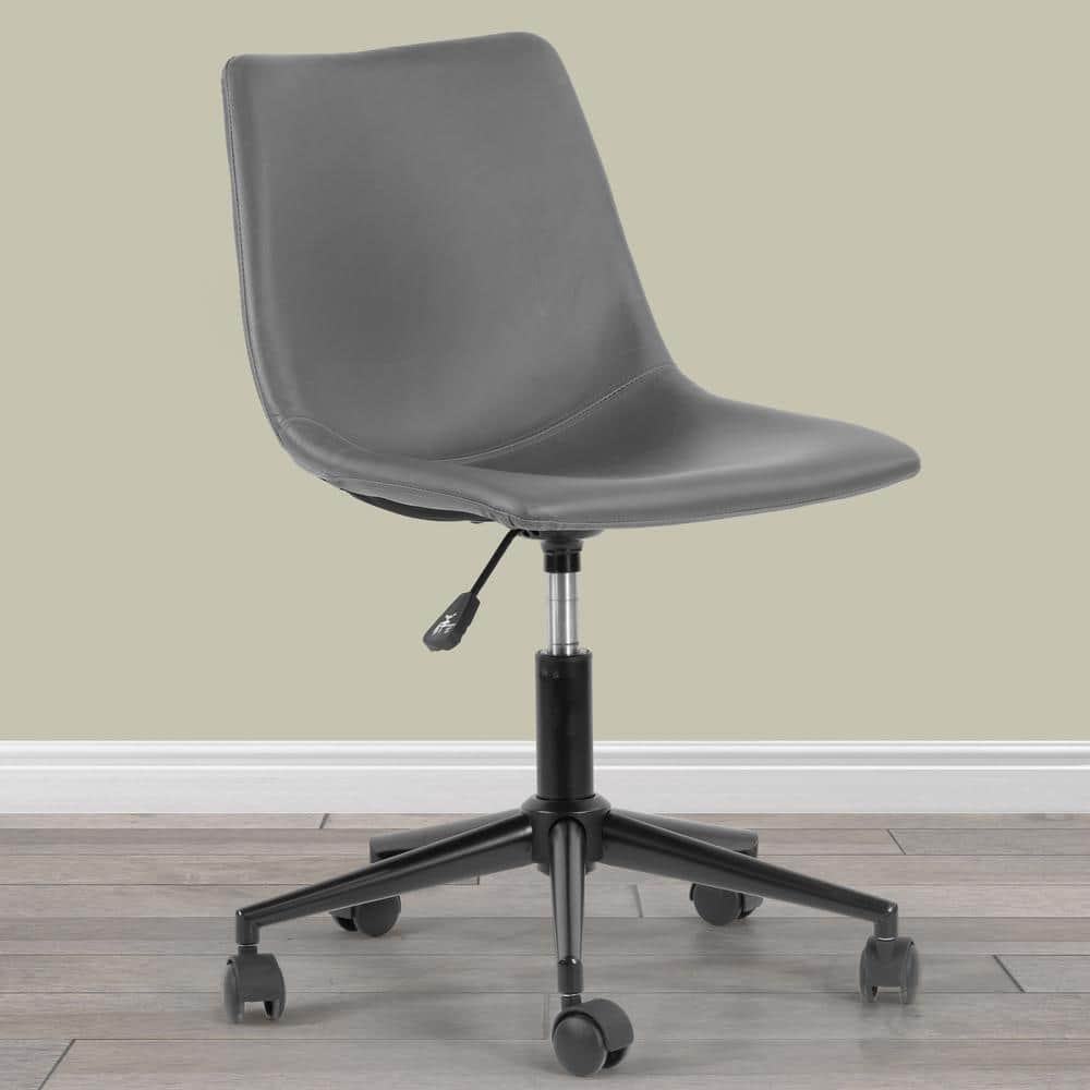 Elevate your workspace with this sleek, gray faux leather task chair. Its armless design and 360-degree swivel offer maximum flexibility, while the height-adjustable feature ensures personalized comfort. The sturdy metal base with five wheels provides stability and easy mobility. Perfect for modern, minimalist offices.