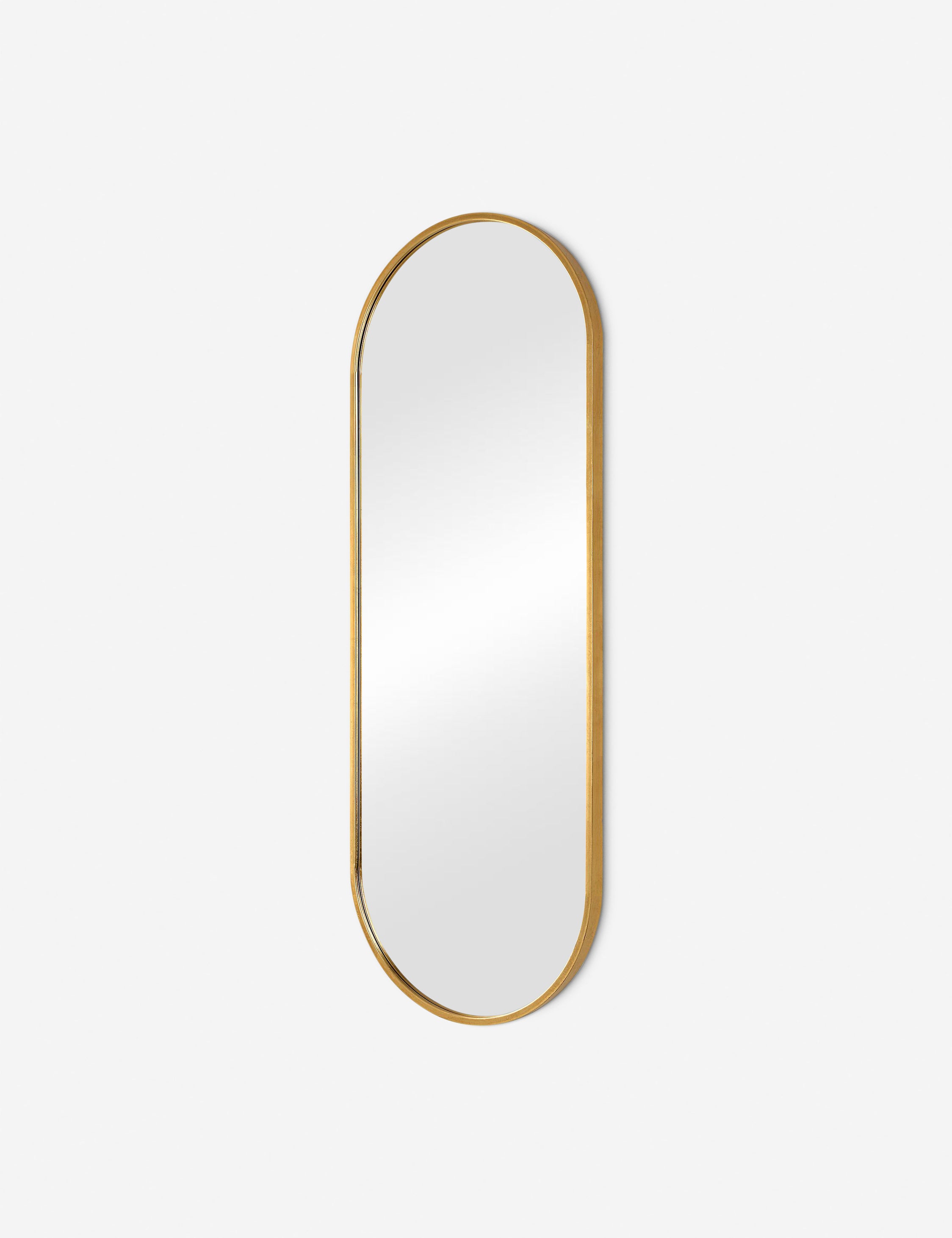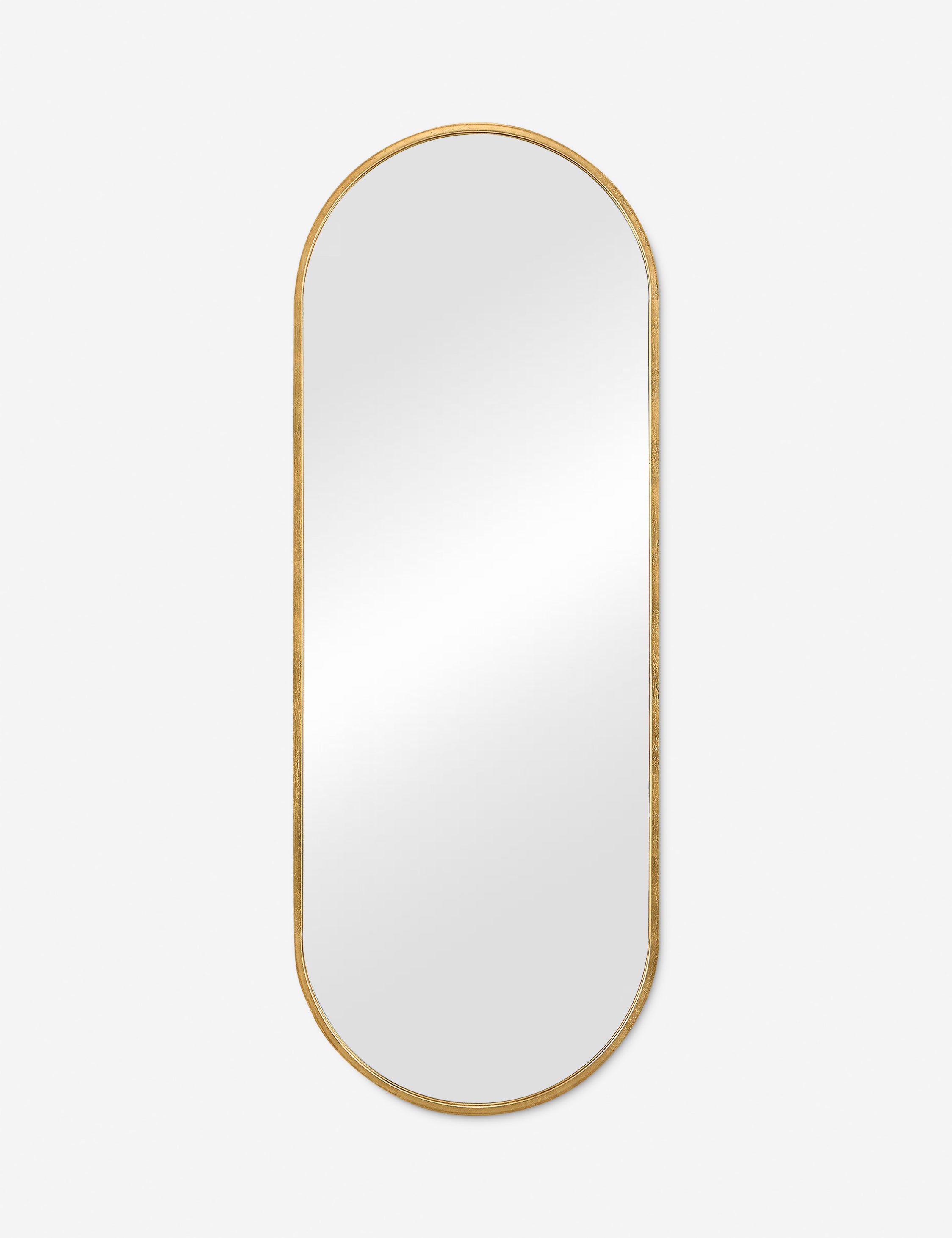 Elevate your space with this elegant gold oval full-length mirror. Featuring a sleek wood frame and a lightly antiqued gold leaf finish, it adds a touch of sophistication to any room. Perfect for entryways, bedrooms, or bathrooms.