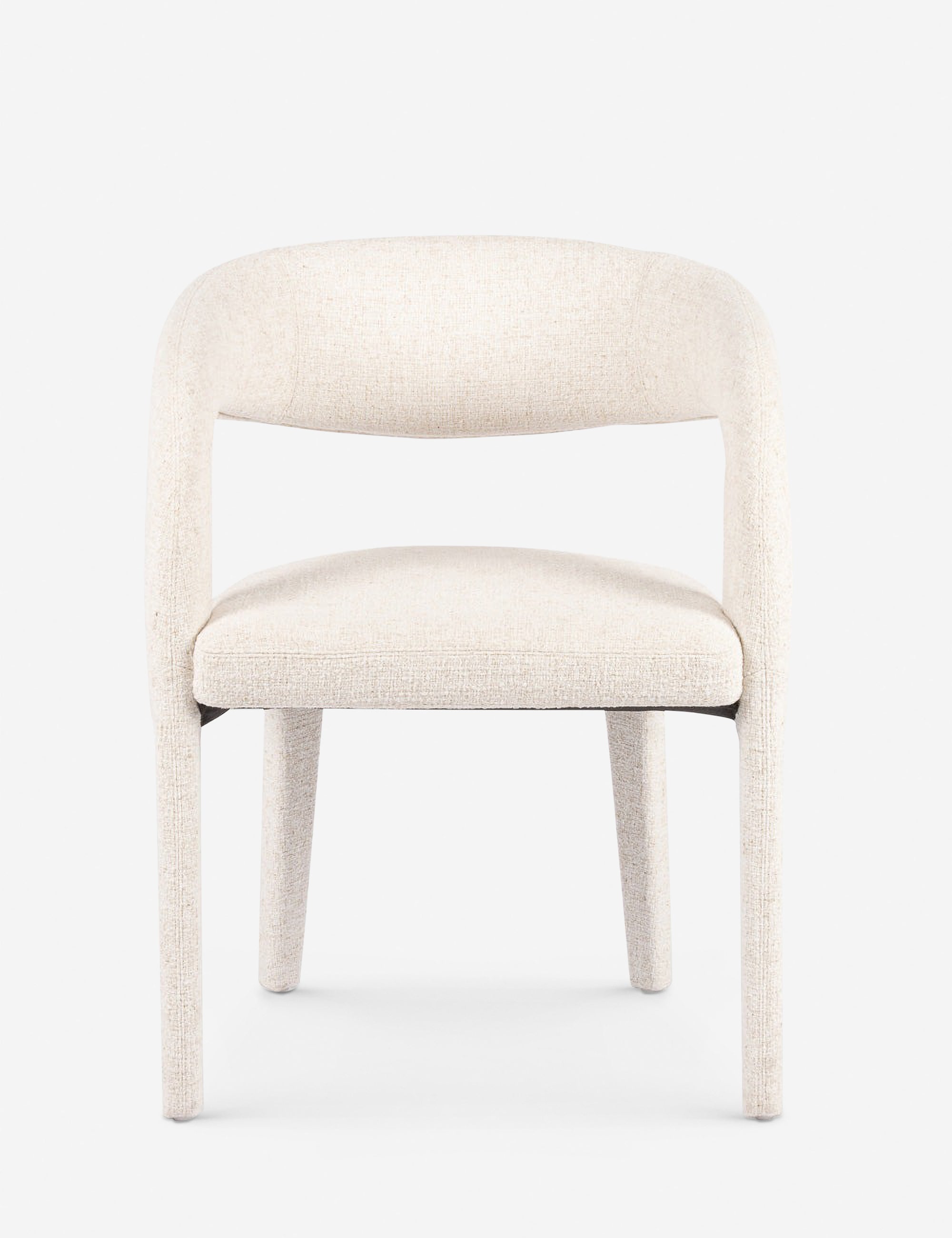 Embrace modern elegance with this beautifully sculpted arm chair, featuring off-white high-performance leather and a sturdy wood frame. Its comfortable webbing seat construction and stylish silhouette make it a perfect addition to elevate your dining or living space.