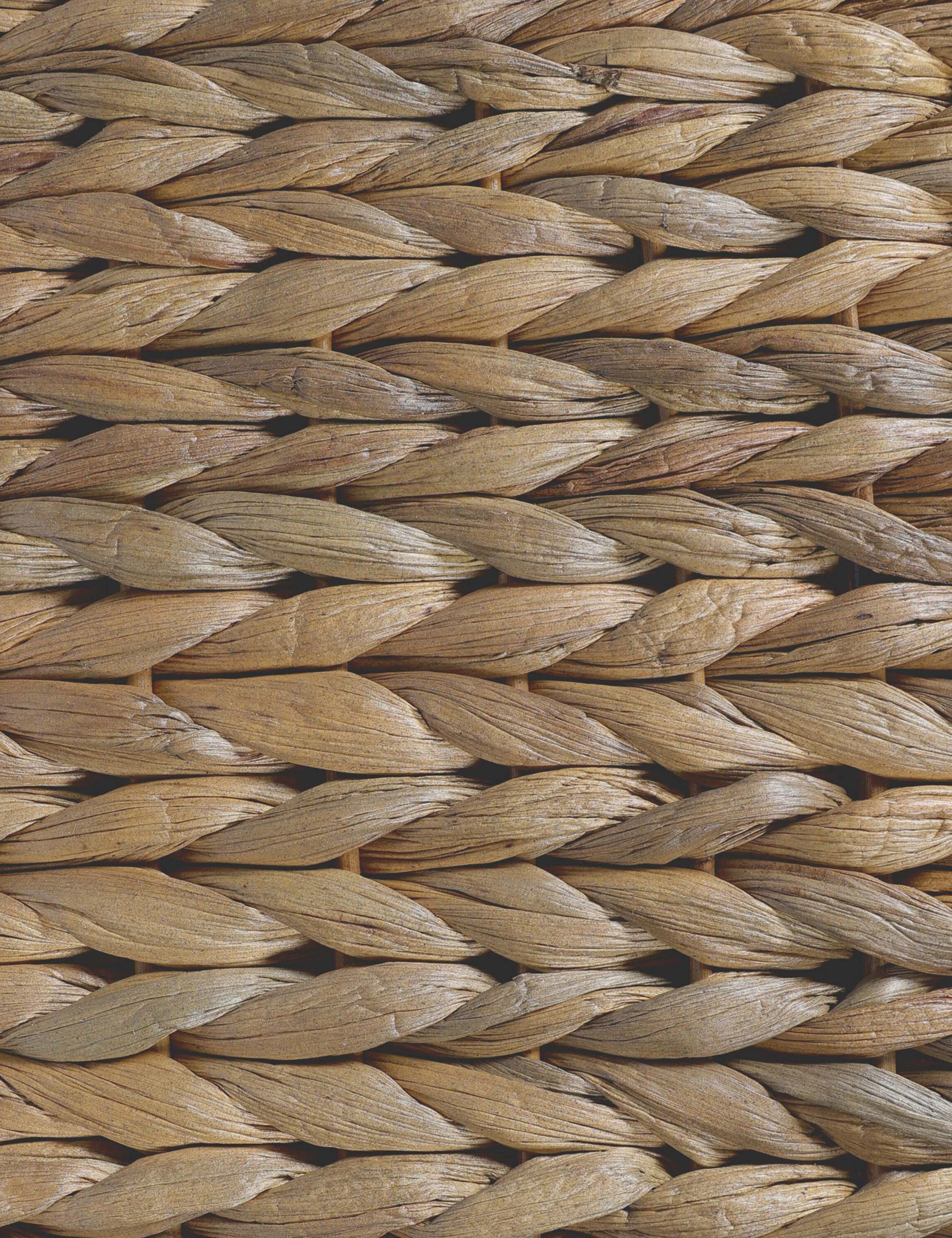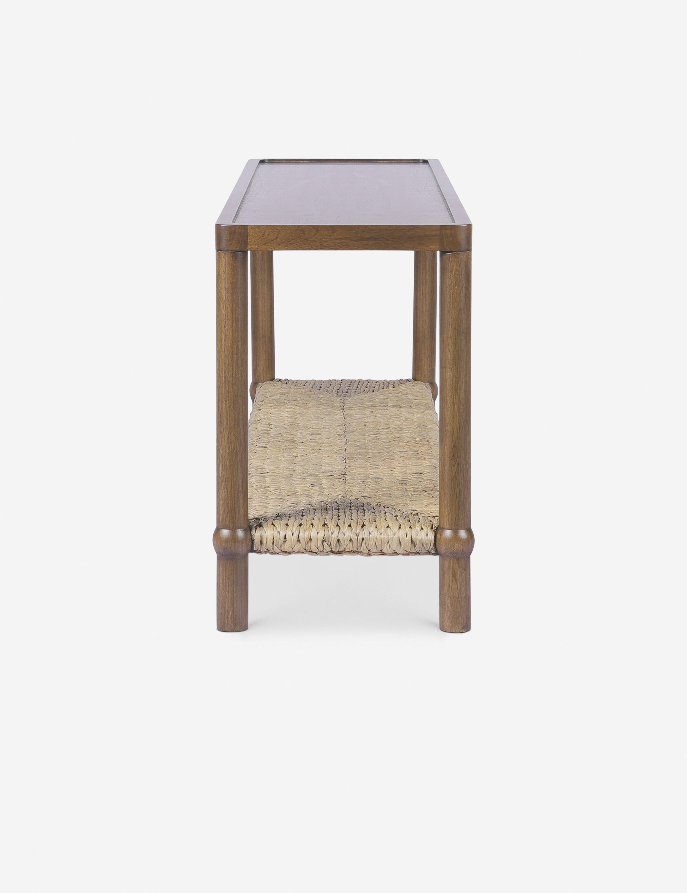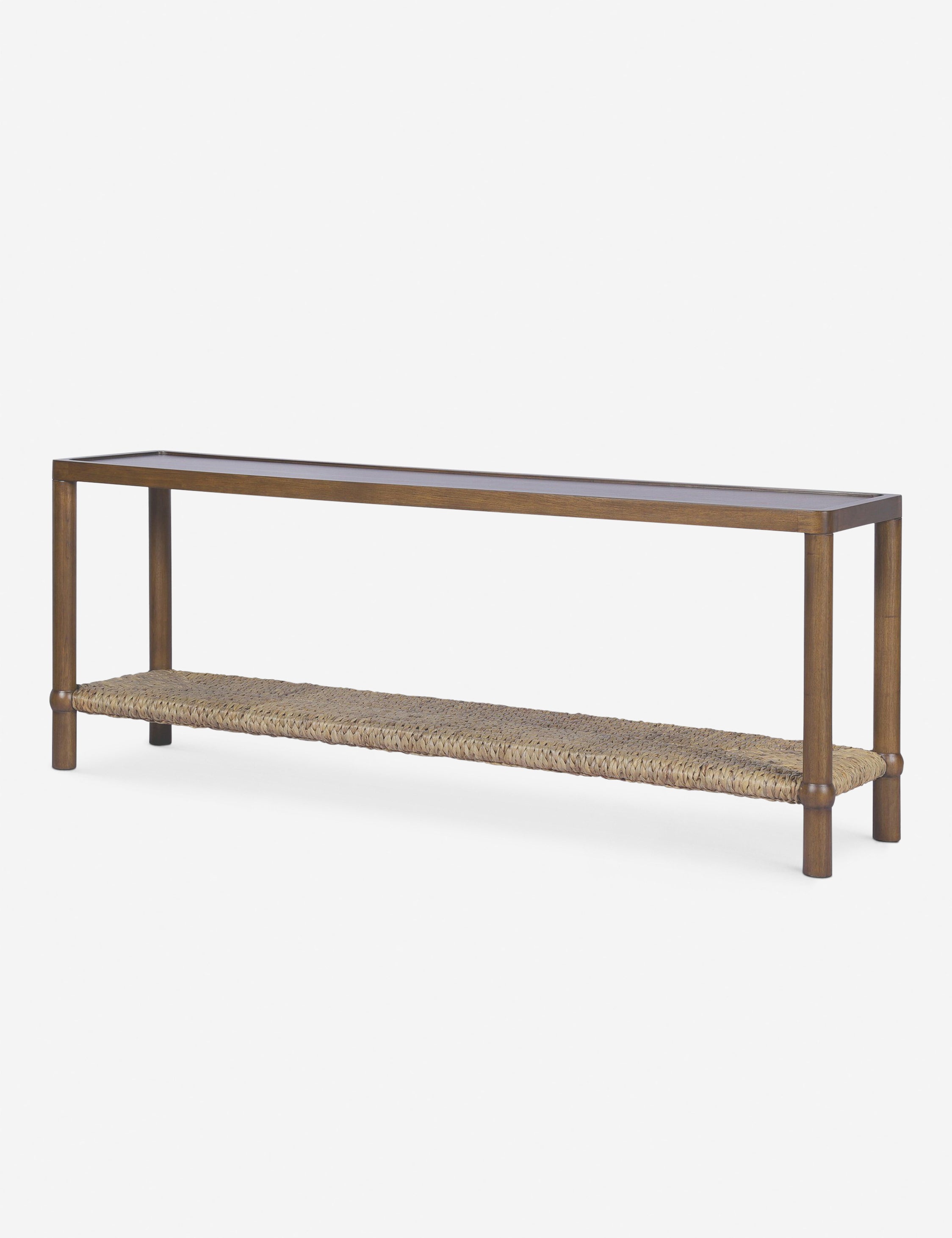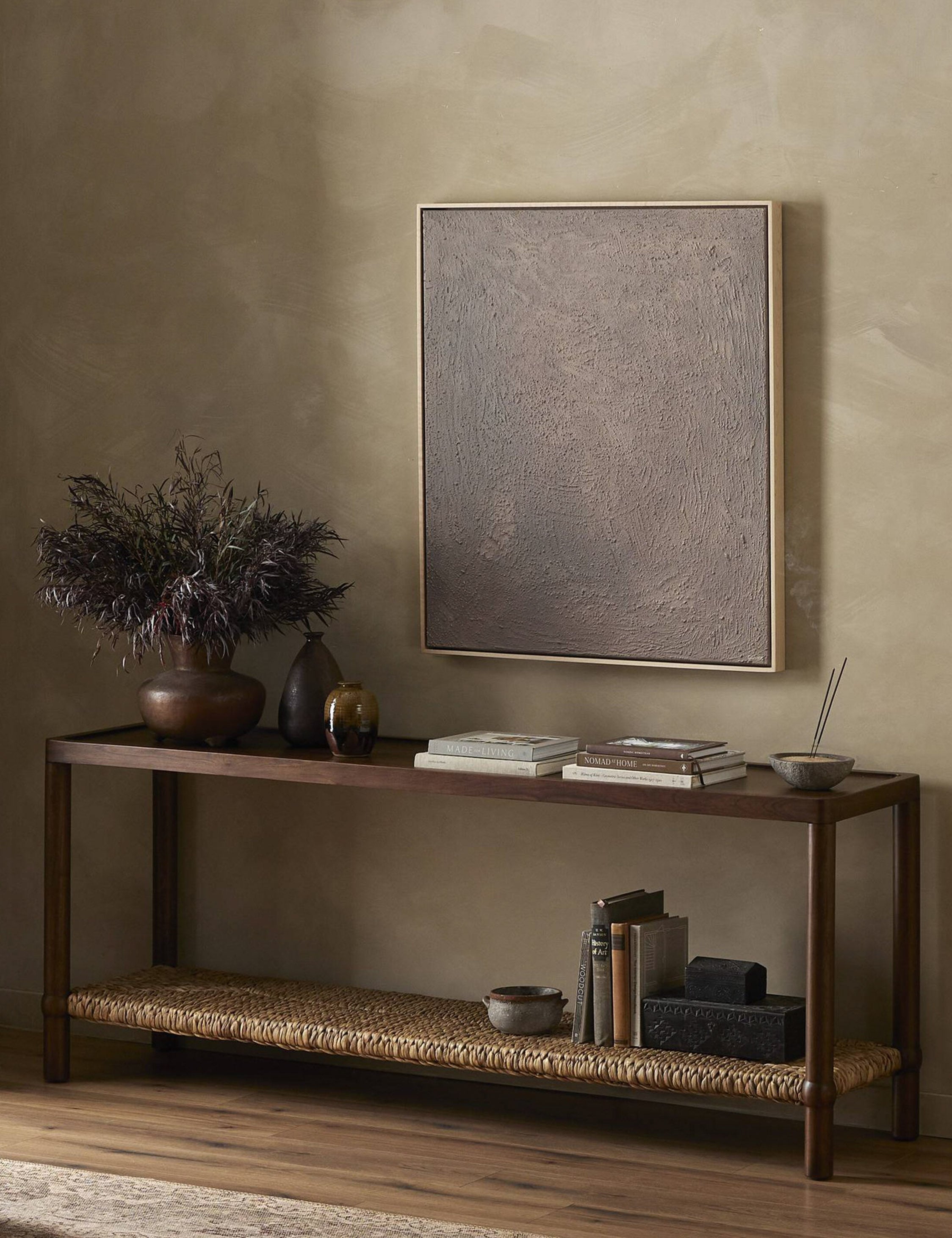 This console table combines modern design with traditional elements. Featuring a warm brown wood finish and a woven lower shelf, it offers both style and storage. Perfect for any living room setting.