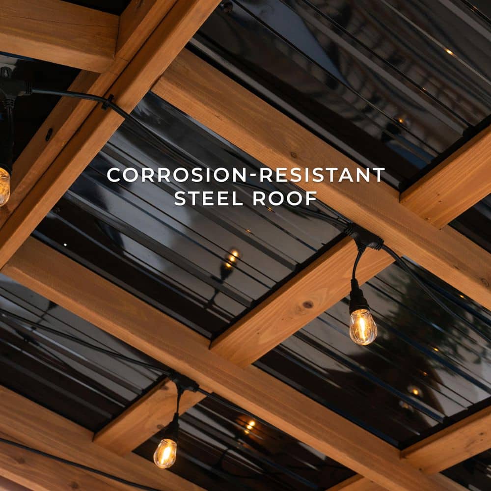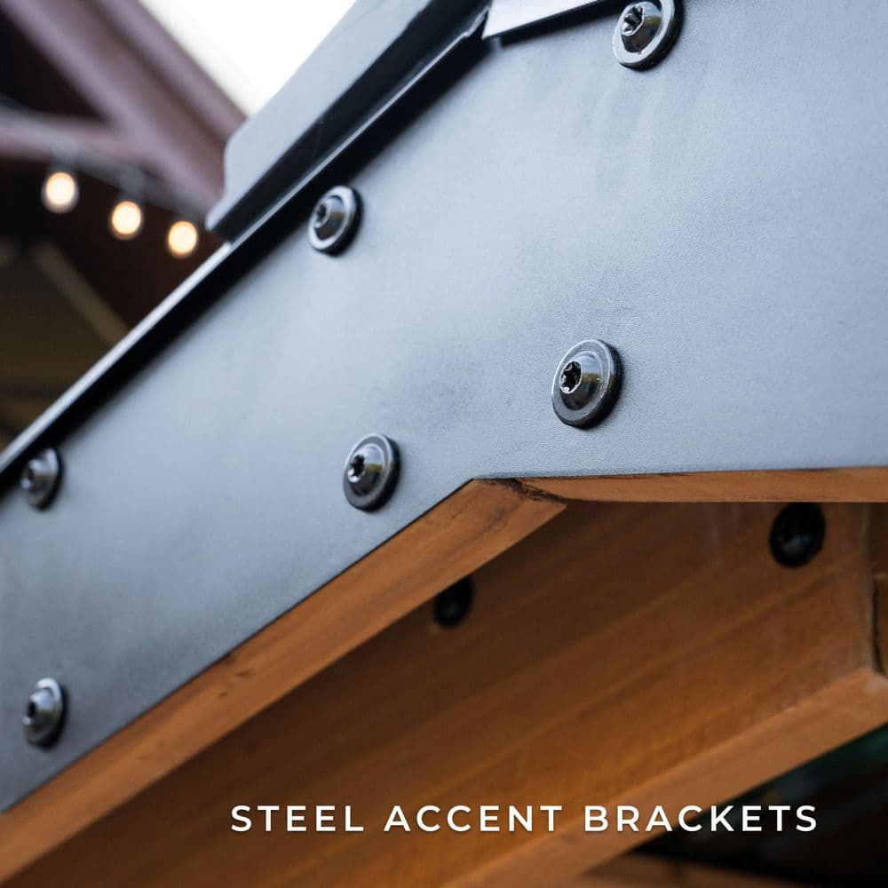 Transform your backyard into an entertainment haven with the Granada Grill Gazebo. Crafted from durable cedar wood and featuring a sleek black steel roof, this gazebo offers a stylish and functional space for outdoor grilling and bar setups. With customizable bar heights and built-in USB ports and outlets, it's perfect for any gathering.