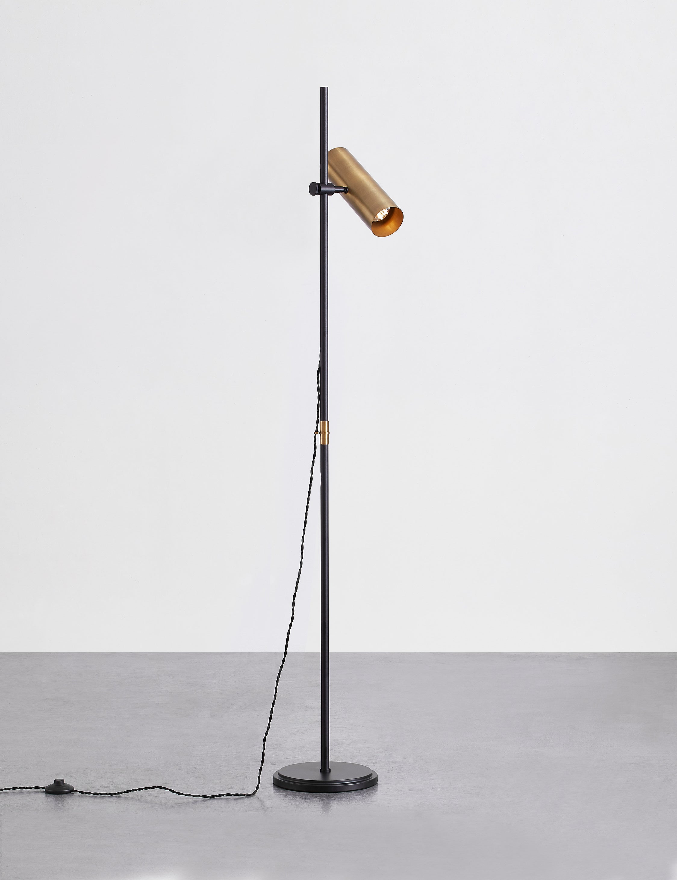 Elevate your outdoor space with this adjustable floor lamp. Featuring a sleek black frame and a brass-finished cylindrical shade, it combines industrial and mid-century modern styles. Perfect for task lighting, its adjustable height and angle offer versatility and functionality.