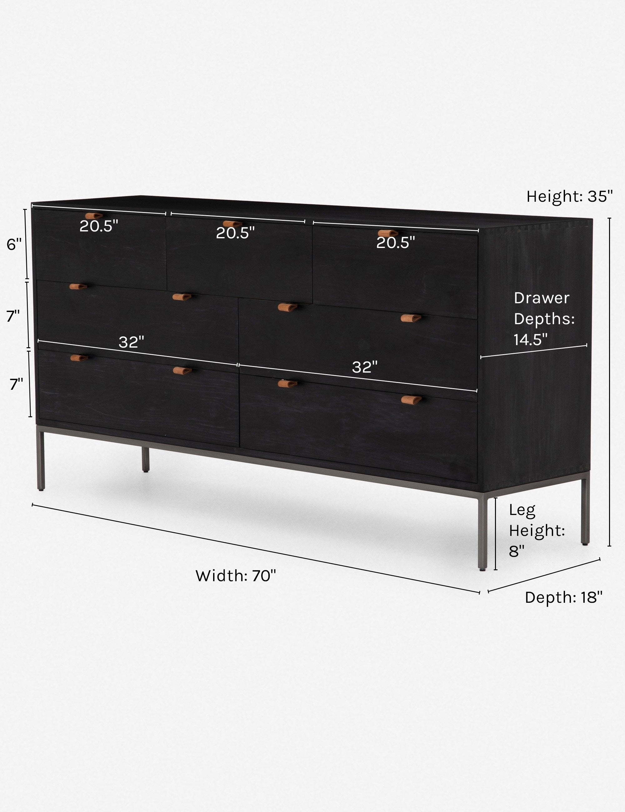 Elevate your bedroom with this sleek 7-drawer dresser, blending mid-century design with contemporary flair. Crafted with a slim iron base and adorned with top-grain leather pulls, this piece offers ample storage while adding a touch of elegance. Dovetail drawers ensure durability, making this dresser not only a stylish but also a practical addition to your space.