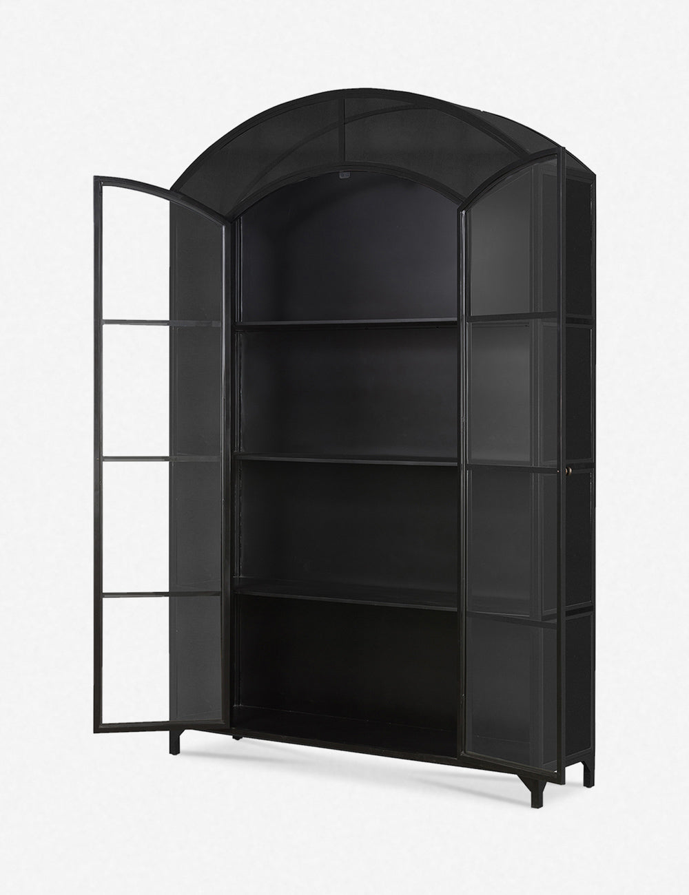 Showcase your treasures in this stunning arched curio cabinet. Crafted from solid iron and glass, it features a matte black finish and brass hardware for a touch of elegance. Perfect for adding a dramatic display to any room.