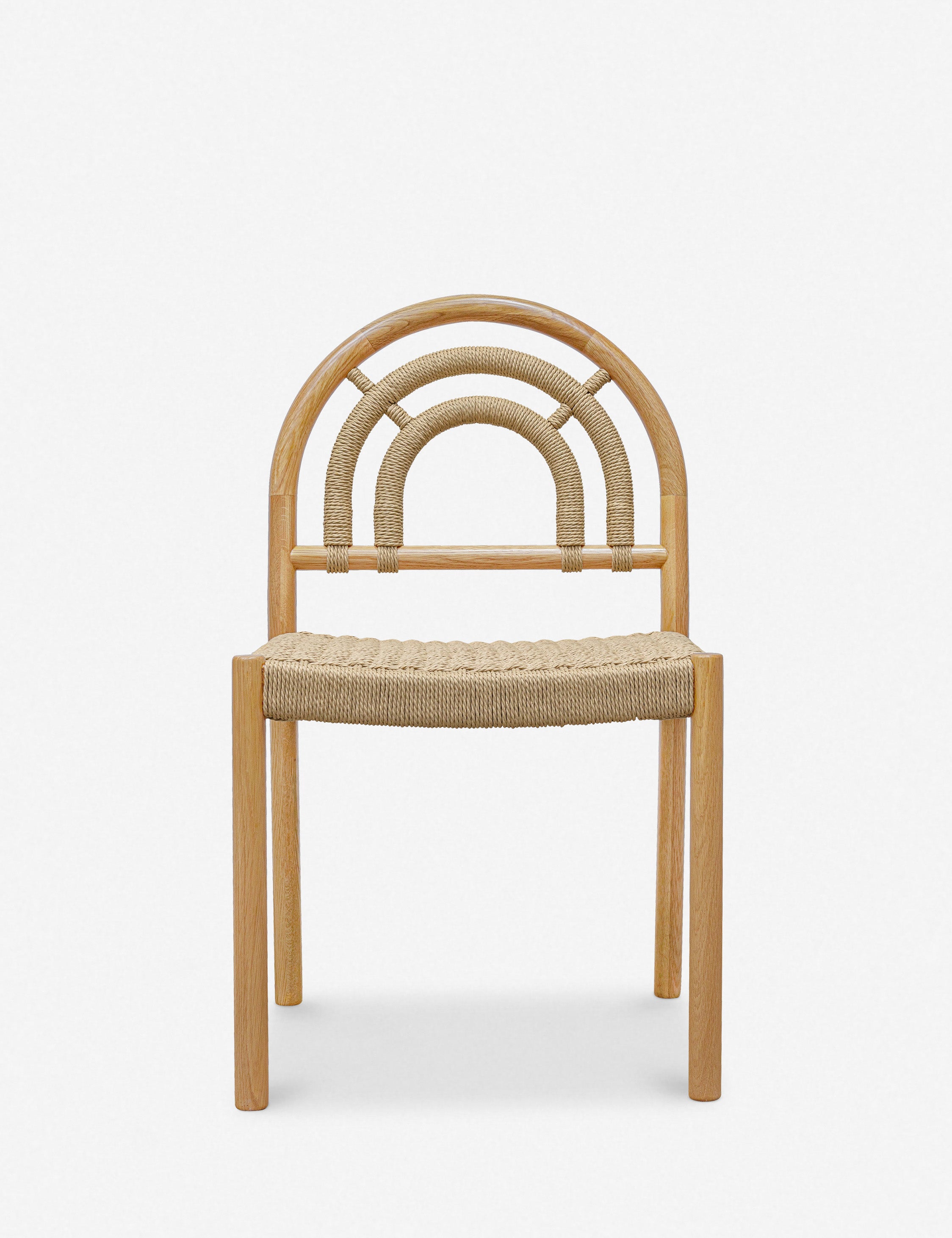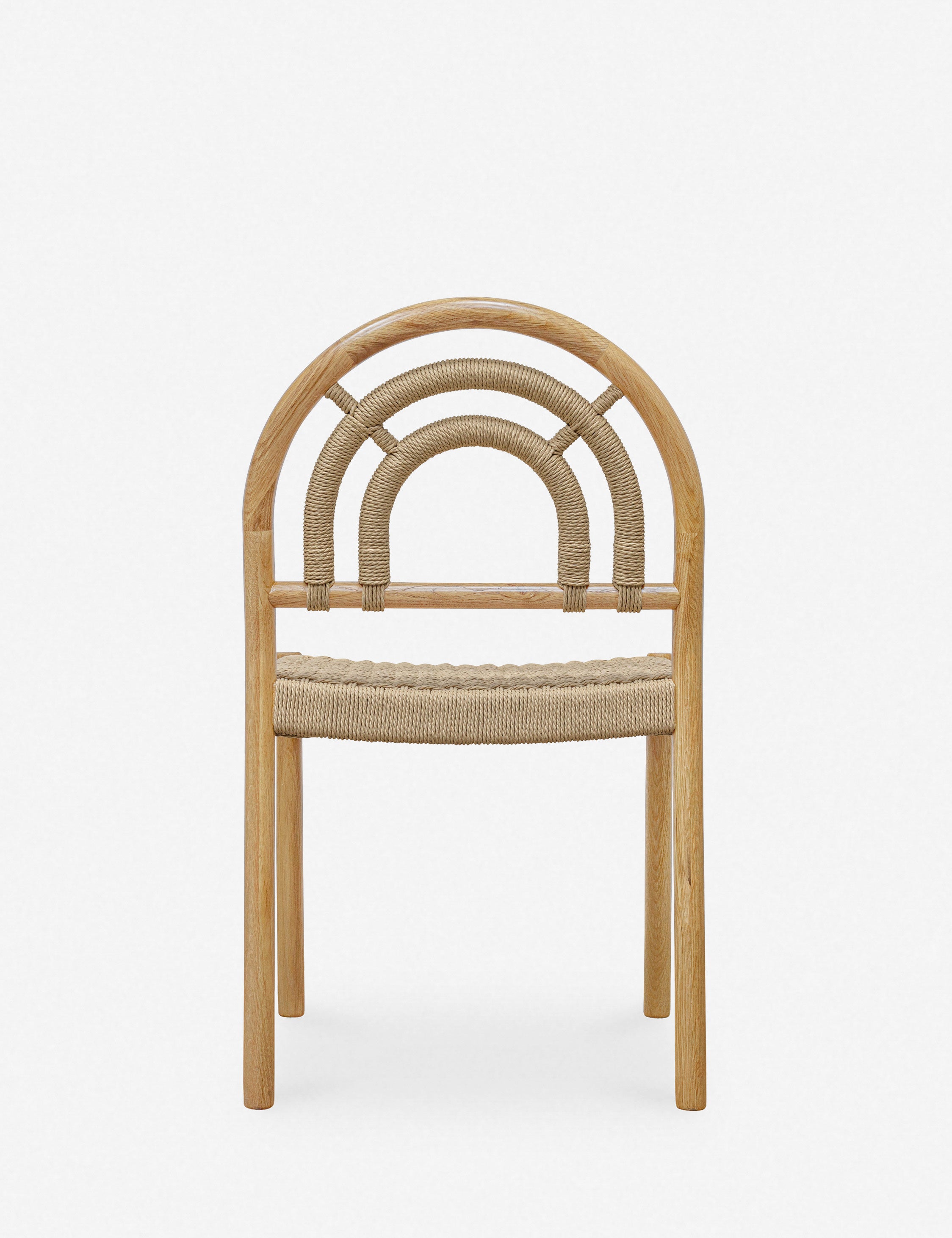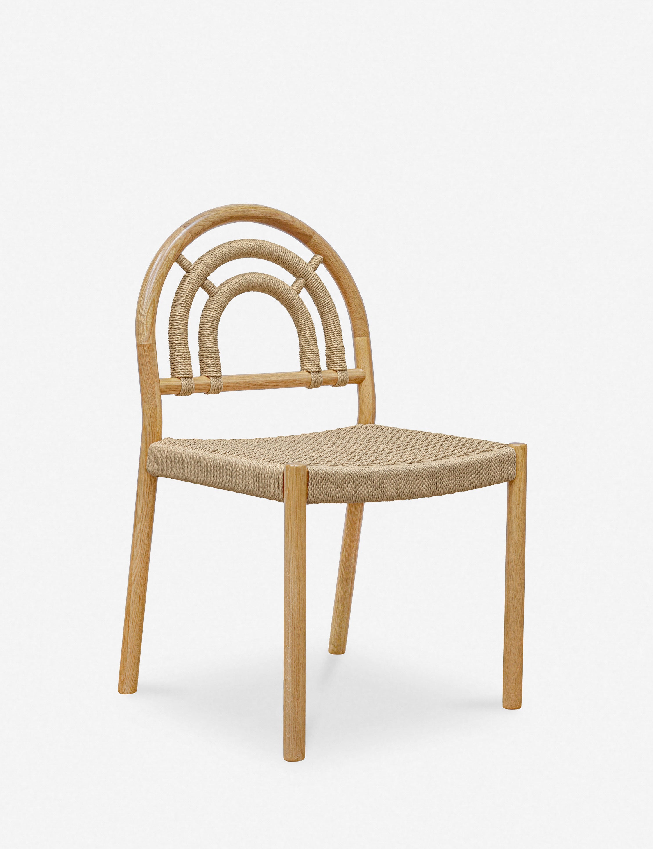 Elevate your dining space with this set of natural oak and cane arched back dining chairs. Featuring a woven paper rope seat and cane-wrapped details, these chairs offer a blend of modern design and timeless warmth. Perfect for a cozy breakfast nook.