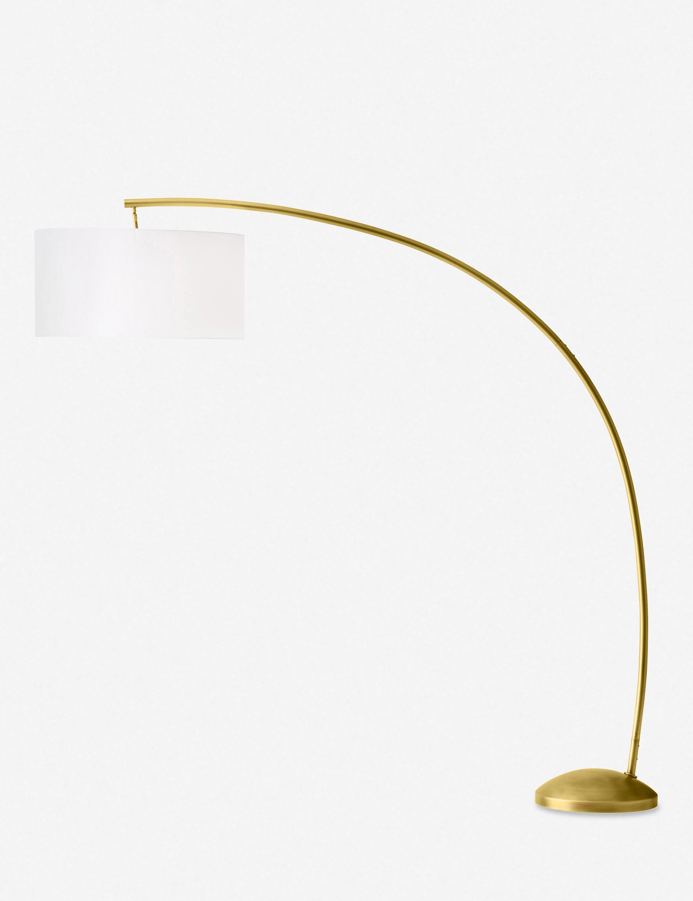 Craft an inviting ambiance with this luxurious floor lamp, featuring an elegant antique brass finish and a gracefully arced design. The oversized linen shade pivots for versatile lighting, making it perfect for both accentuating your space and task lighting. Its sleek profile adds a touch of modern sophistication to any room.